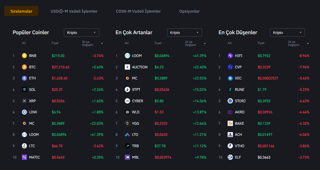 Hadi gelin Binance‘de listelenmiş altcoin’lerin bugünkü performanslarına birlikte göz atalım: