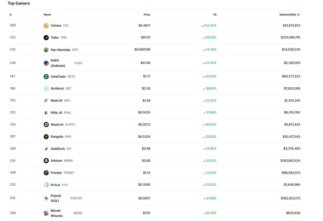 Başarılı bir veri sağlayıcısı CoinMarketCap’in aktardığı bilgilere göre ilk 500 kripto para birimi içerisinde bu hafta özelinde en çok artışı Celsius (CEL) isimli altcoin gerçekleştirdi.