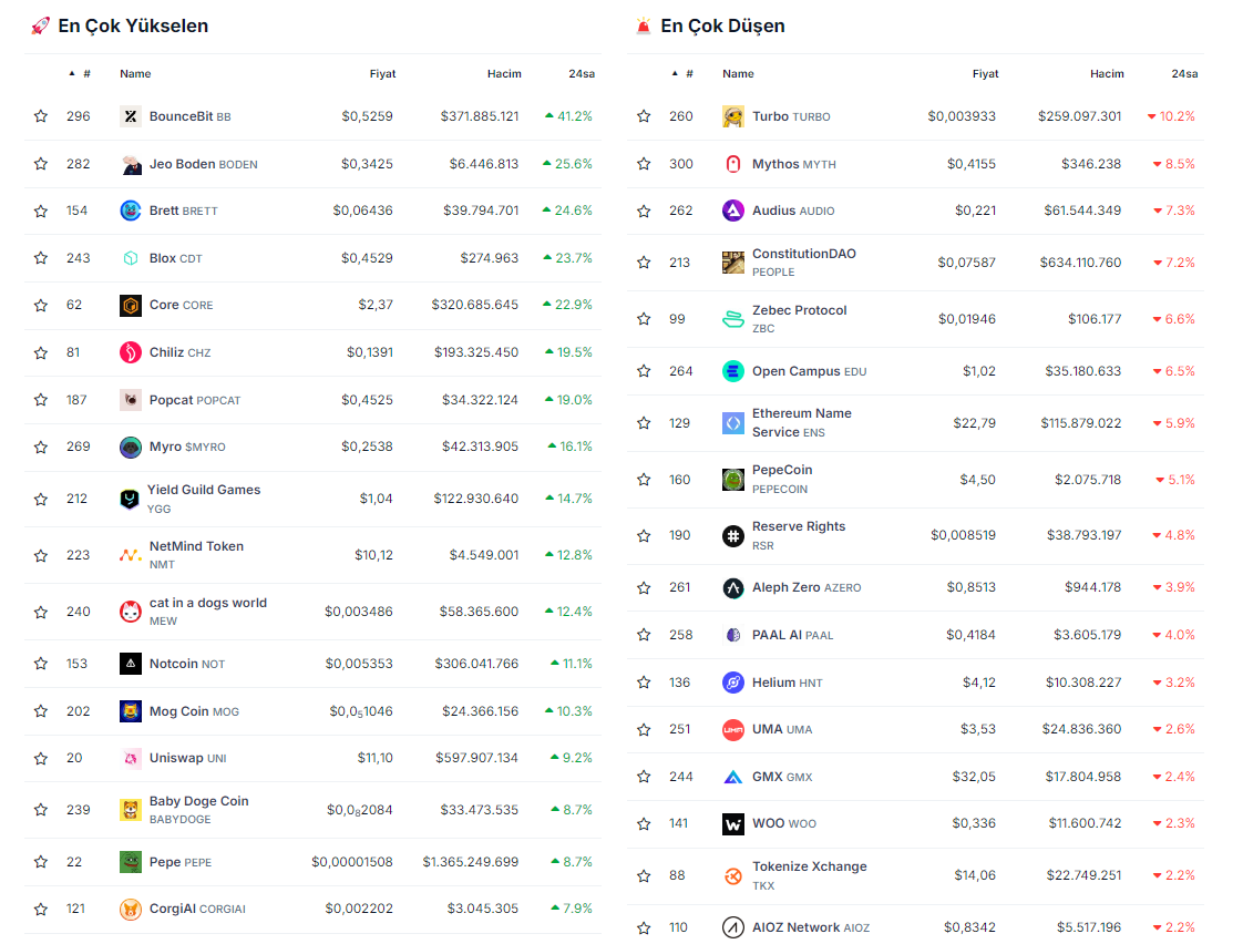 Bugün özelinde altcoin’lerde genellikle yükselişler meydana geldi. İlk 300 kripto para birimi içerisinde bugün itibariyle en çok artan altcoin BounceBit (BB) oldu.