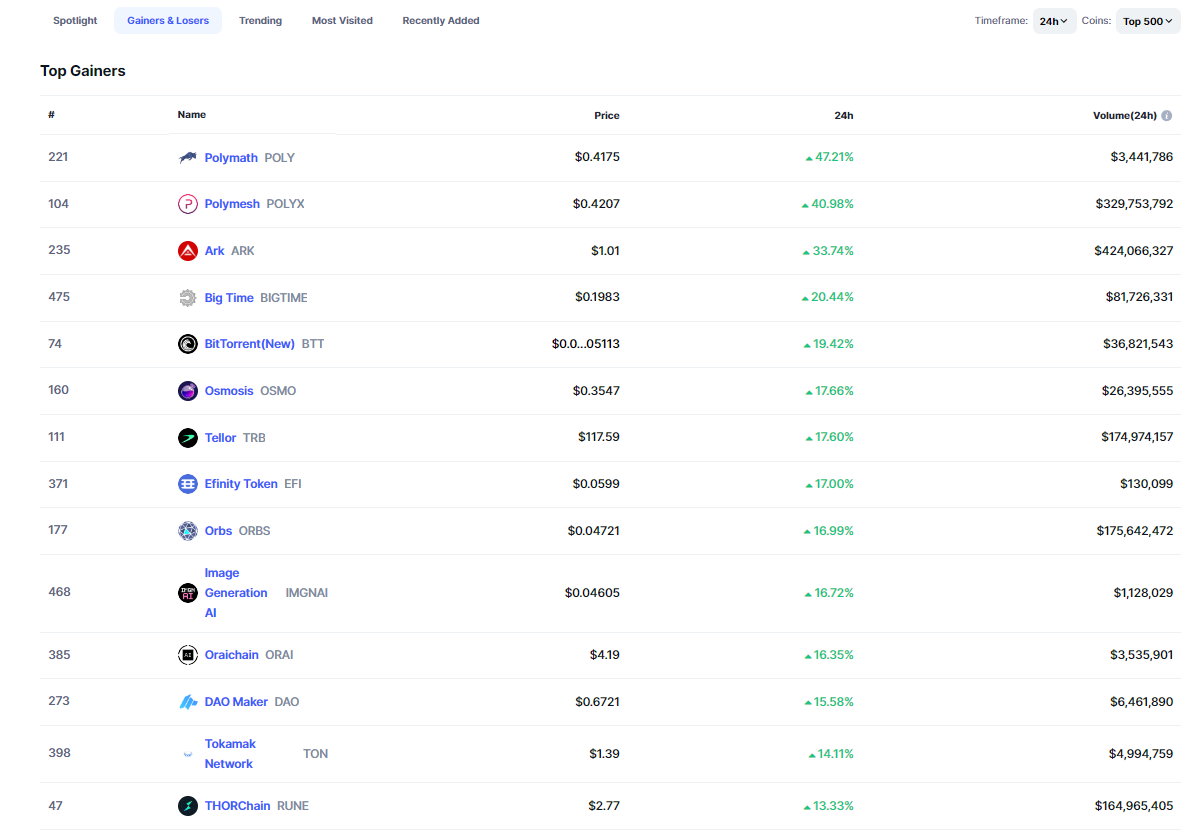Başarılı bir veri sağlayıcısı olan CoinMarketCap’in aktardığı bilgilere göre piyasa değerine göre ilk 500 kripto para birimi içerisinde bugün itibariyle en büyük yükselişi Polymath (POLY) ve Polymesh (POLYX) isimli altcoin’ler gerçekleştirdi.