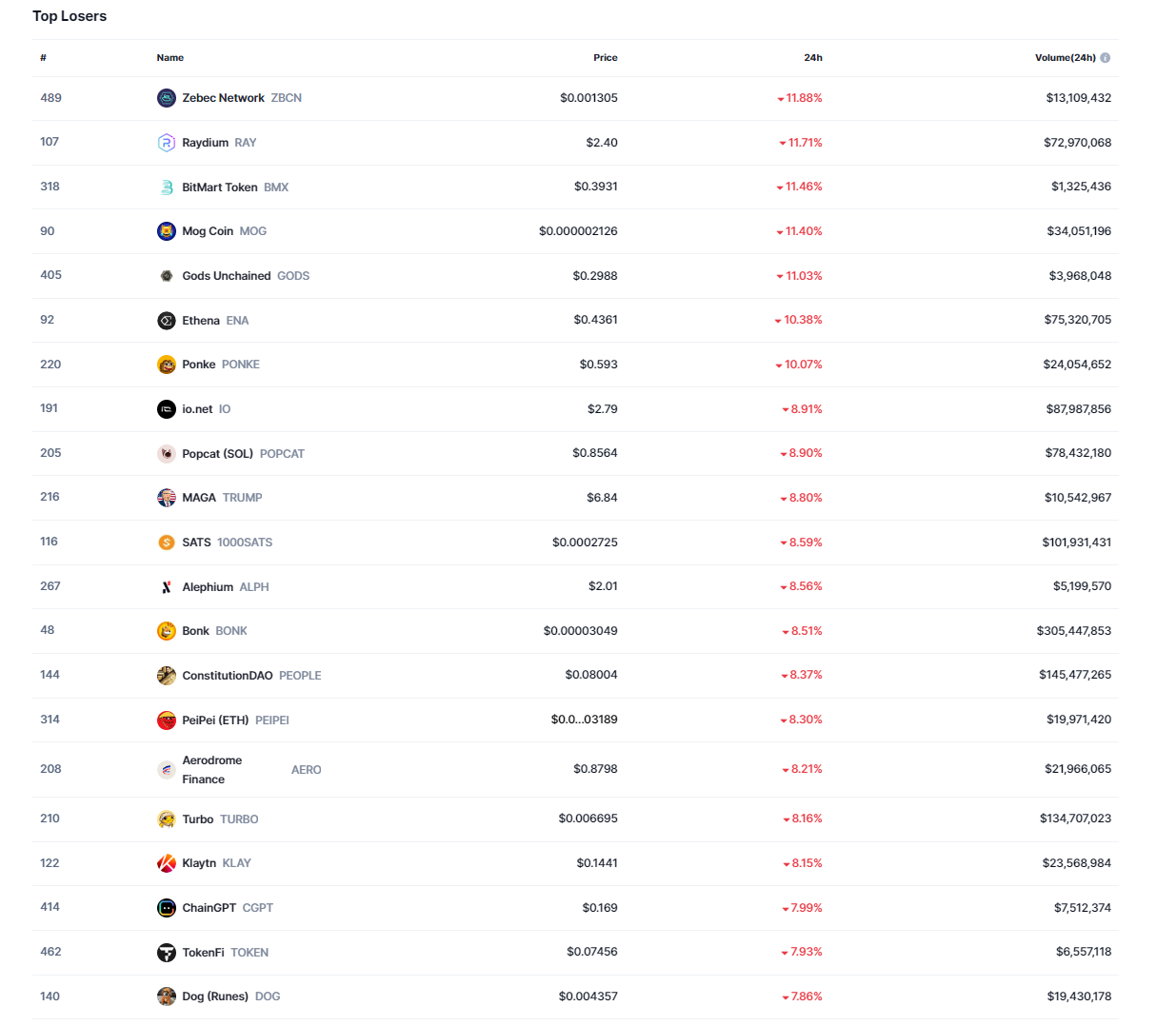 Bugün ZBCN’nin haricinde RAY, BMX, MOG, GODS, ENA ve PONKE de yüzde 10’dan fazla değer kaybetti.