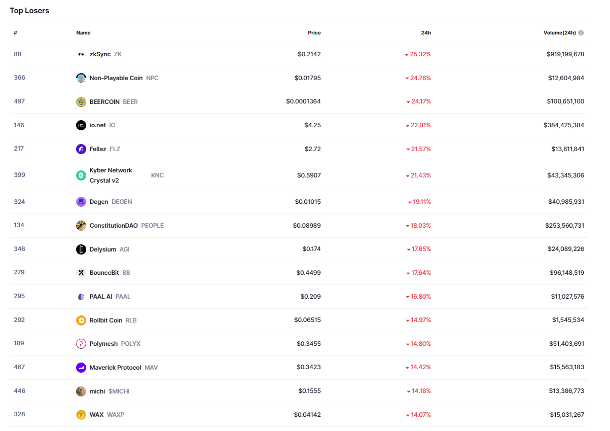 ZK bugün %25 oranında değer kaybederken, NPC, BEER, IO, FLZ ve KNC‘nin de %20’den fazla düşüş yaşadığı gözlemlendi.