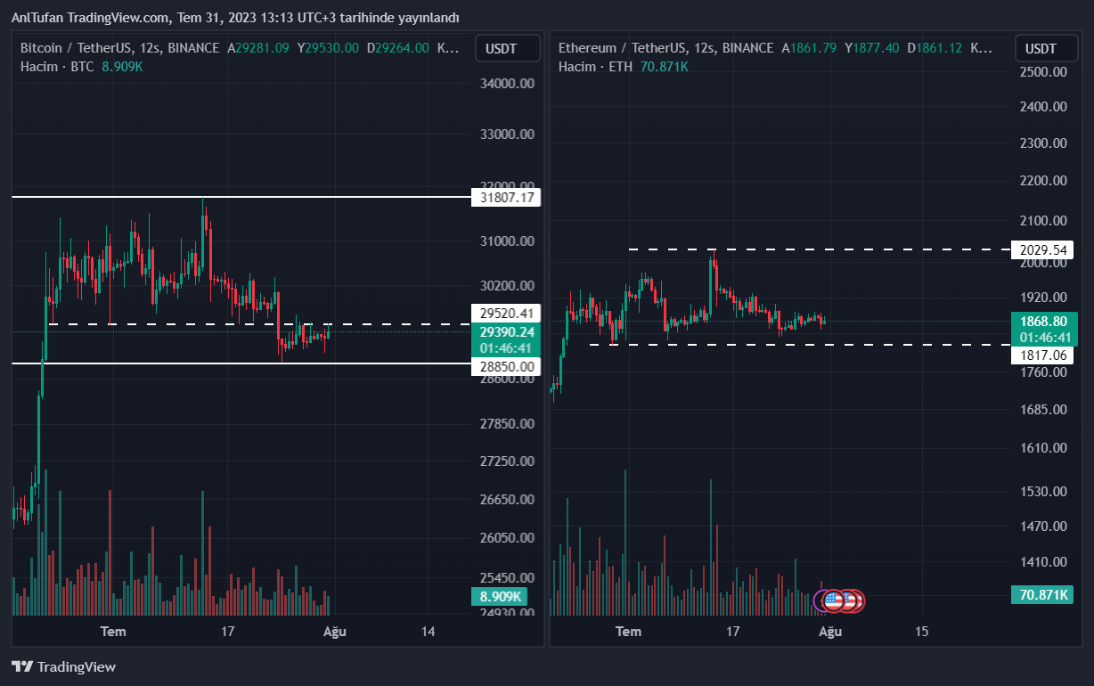 Haberimizin yazıldığı esnada 29.400 dolar seviyelerinde yer alan BTC, halen yukarı veya aşağı yönlü bir kırılım gerçekleştirmedi. Lider altcoin Ethereum‘un da (ETH) benzer bir durumda olduğu görülüyor.