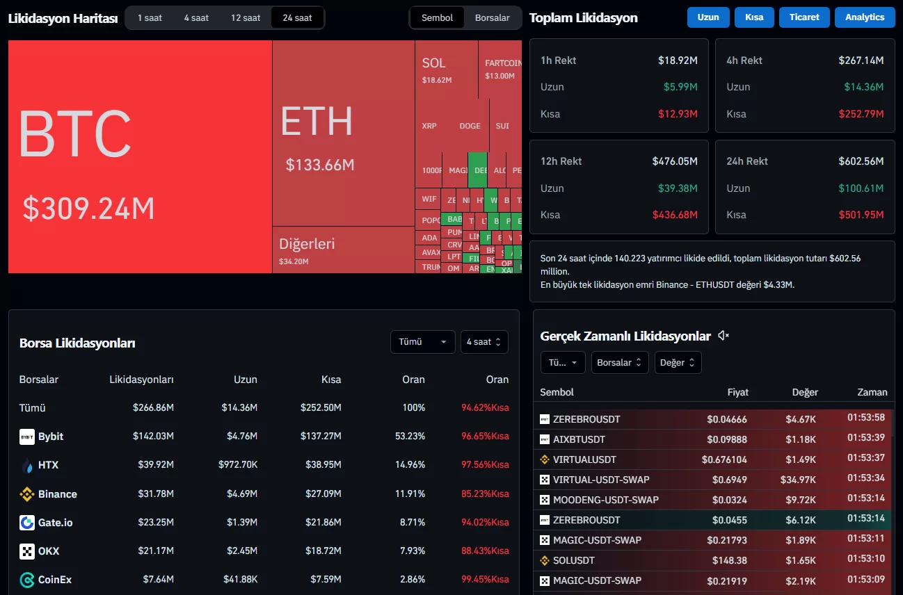 Bitcoin’in 94 bin doları görmesiyle birlikte piyasada toplamda 142 bin yatırımcı likit edildi. En büyük likidasyon BTC’de gerçekleşirken, sonrasında sırasıyla ise ETH, SOL, FARTCOIN, XRP ve DOGE‘nin geldiği görüldü.