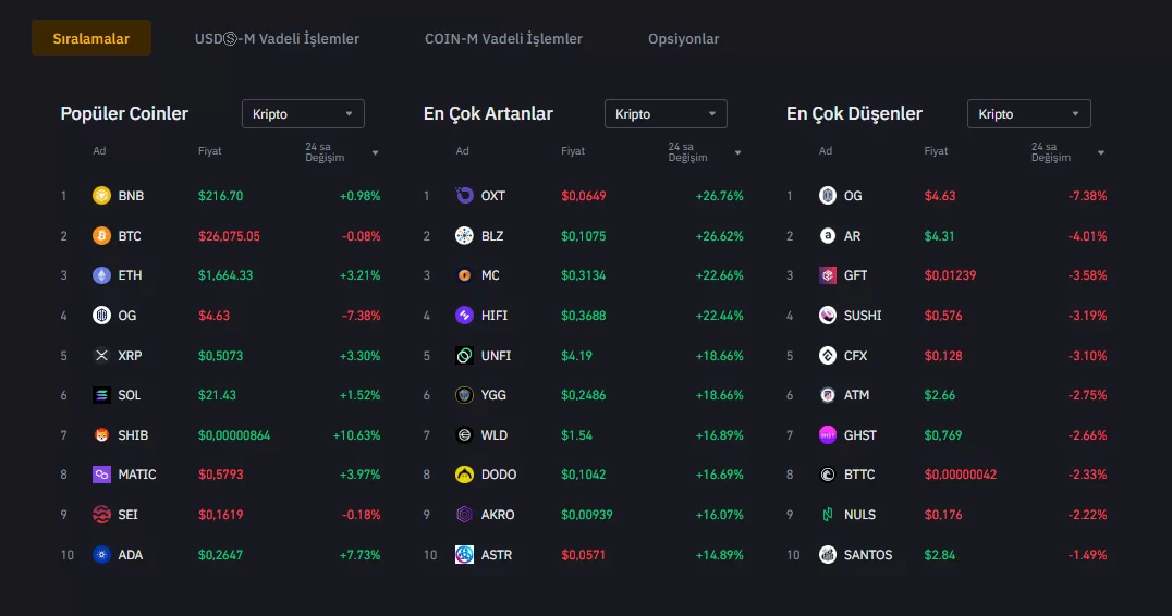 İşlem hacmine göre dünyanın en büyük kripto para borsası Binance’in aktardığı verilere göre bugün itibariyle yükseliş yaşayan altcoin’lerin çoğunlukta olduğu görülüyor.