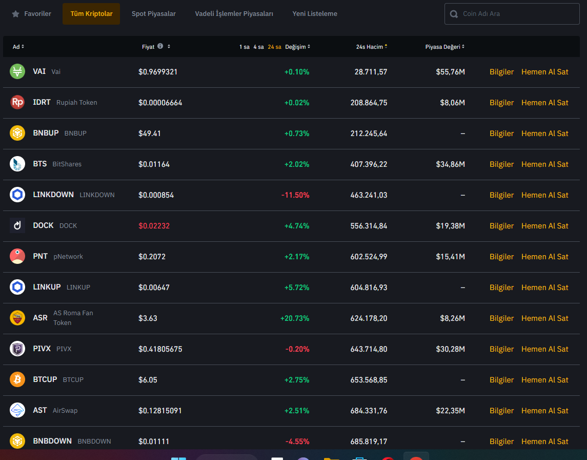 Aşağıdaki listede ise Binance’de listelenmiş en düşük hacme sahip ürünler yer alıyor. Okurlarımızın bu ürünleri yakından takip etmeleri önerilir.