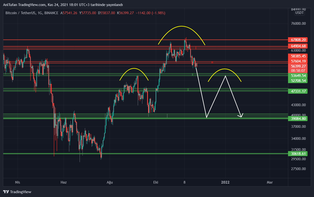 52.000- 53.000 dolar seviyelerine düşüp akümüle olduktan sonra tekrardan yükseliş trendine girmesi beklenen BTC’de kıyamet senaryoları da yok değil. Aşağıda ki grafikte de belirttiğimiz gibi bir hareket yapması durumunda Bitcoin çok yatırımcının canını yakabilir.