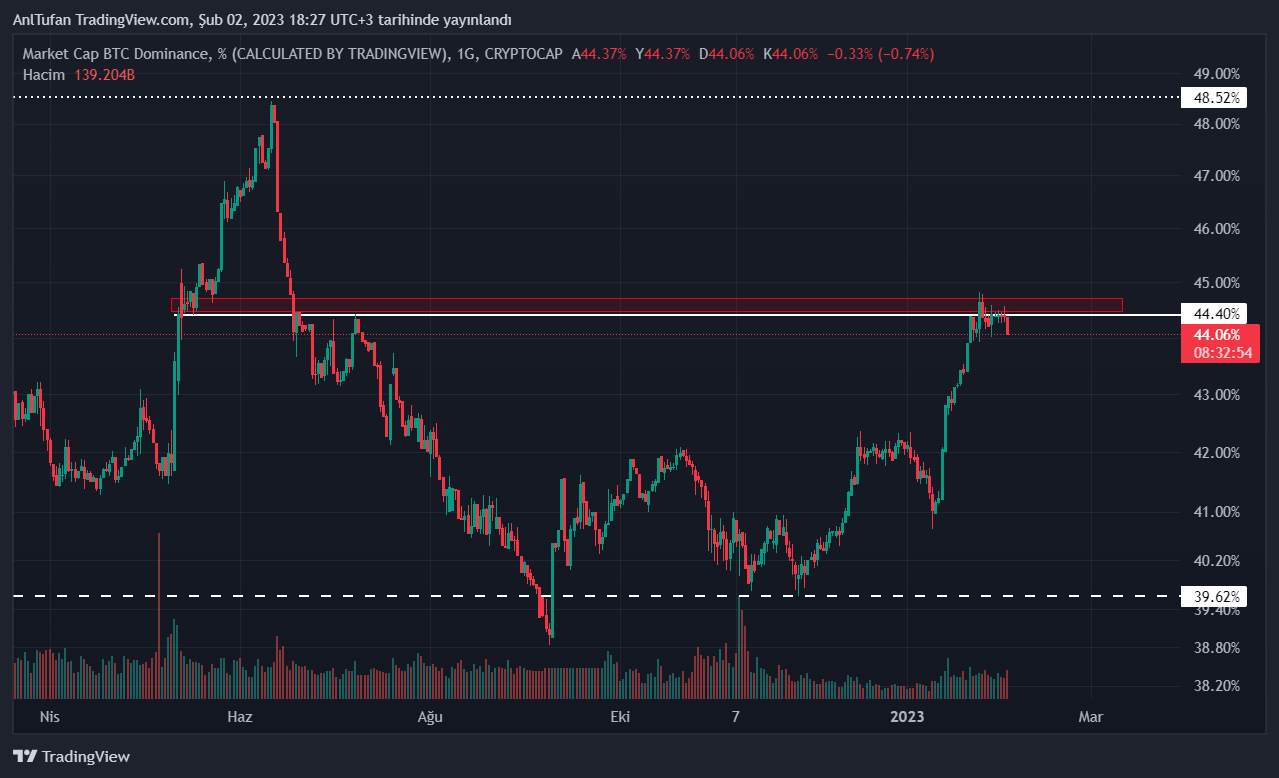 Yüzde 44.4 direncinden reddedilen BTC dominans tablosu, ilerleyen günlerde yüzde 40’lı seviyelere gerilemesi ile birlikte yatırımcıların 1 yıldan uzun bir süredir beklediği sert altcoin rallisinni yaşanmasını sağlayabilir.