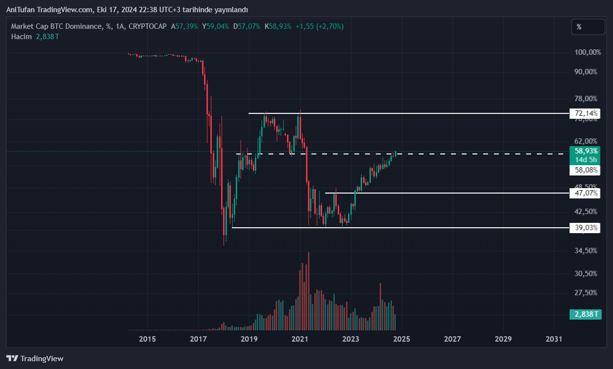 Önümüzdeki günlerde Bitcoin hakimiyetinin %58 direncinin altına sarkması altcoin fiyatlarında yükseliş getirebileceği gibi bu seviyenin destek haline gelmesi BTC dominansındaki yükselişlerin devam etmesine yol açabilir.