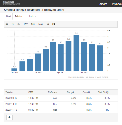 Başarılı bir veri sağlayıcısı olan TradingEconomics’in aktardıklarına göre, ABD’de açıklanacak enflasyon oranlarında beklentilerin yüzde 8 olduğu görülüyor.