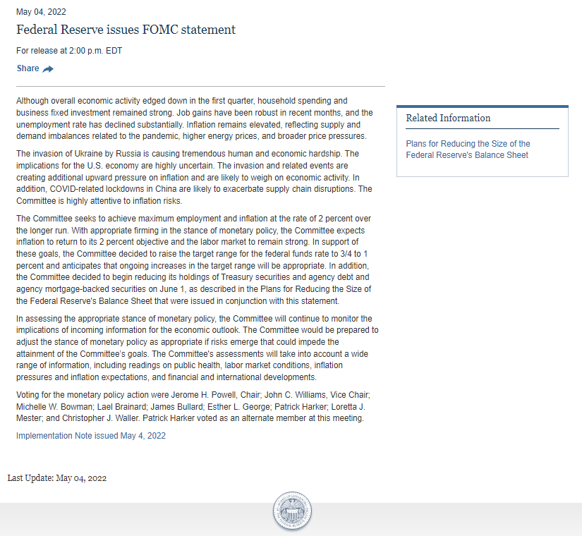 3-4 Mayıs tarihlerinde gerçekleşen FOMC toplantılarının tutanakları geçtiğimiz dakikalarda açıklandı. Bu tarihlerde FED‘in 50 baz puanlık faiz artışı uygulaması, piyasaların çöküş yaşamasına neden olmuştu.