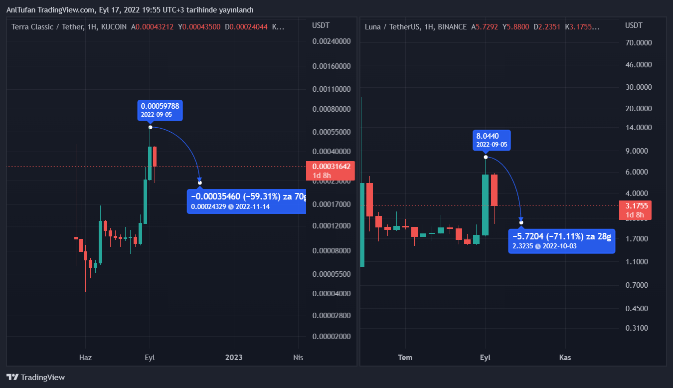Geçtiğimiz hafta yaşanan yükselişler sonucu çöküşe geçen LUNA ve LUNC, geçmiş dönemlerde olduğu gibi yatırımcılara zarar vermeye devam ediyor.