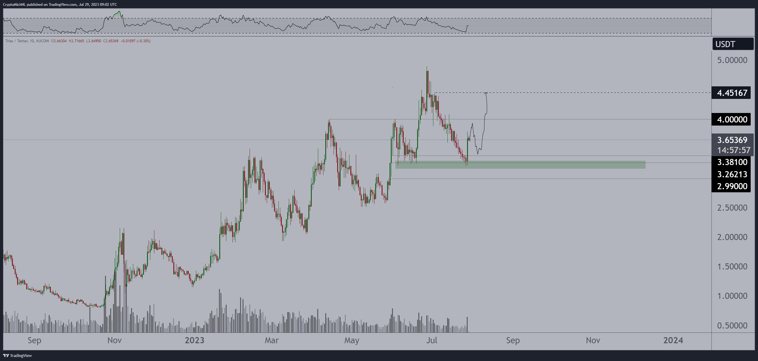 TRIAS isimli altcoin’de halen yükseliş trendinin son bulmadığını aktaran Poppe, ilerleyen süreçte bu ürünün de 4.45 dolar seviyelerine kadar bir sıçrama yapabileceğini söylüyor.