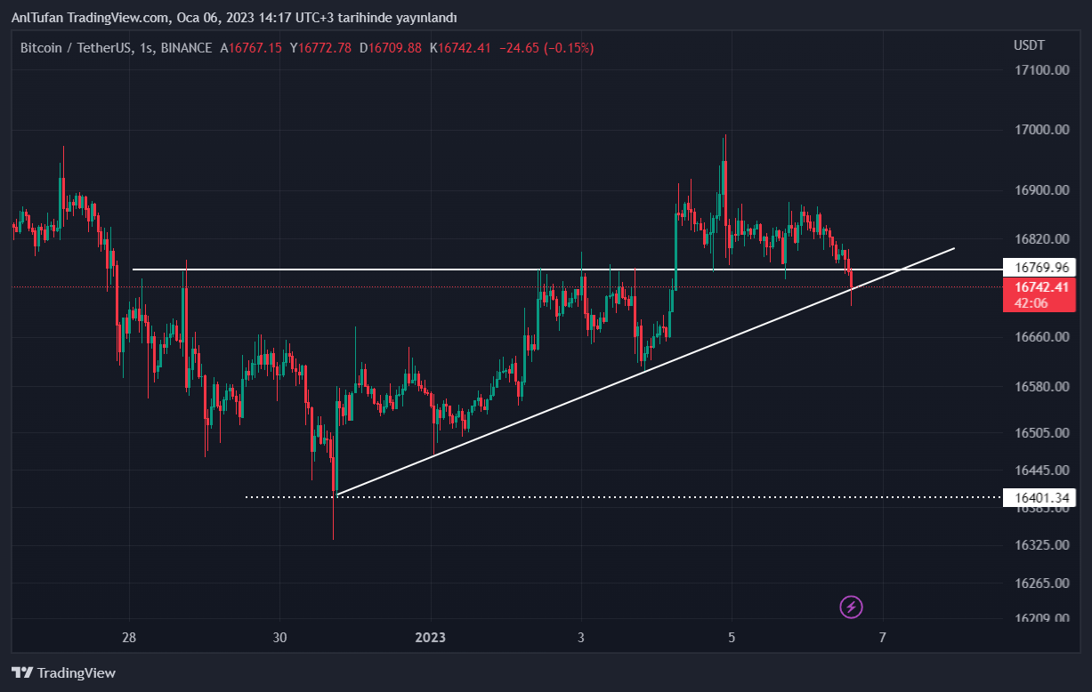 Şuan itibariyle Bitcoin’in 2 gündür üzerinde konumlandığı 16.769 dolar destek seviyesi kırılmış durumda. Bu kırılım ile birlikte BTC bir anda sert düşüş yaşamış olsa da, halen yükselen trendinde tutunmakta.