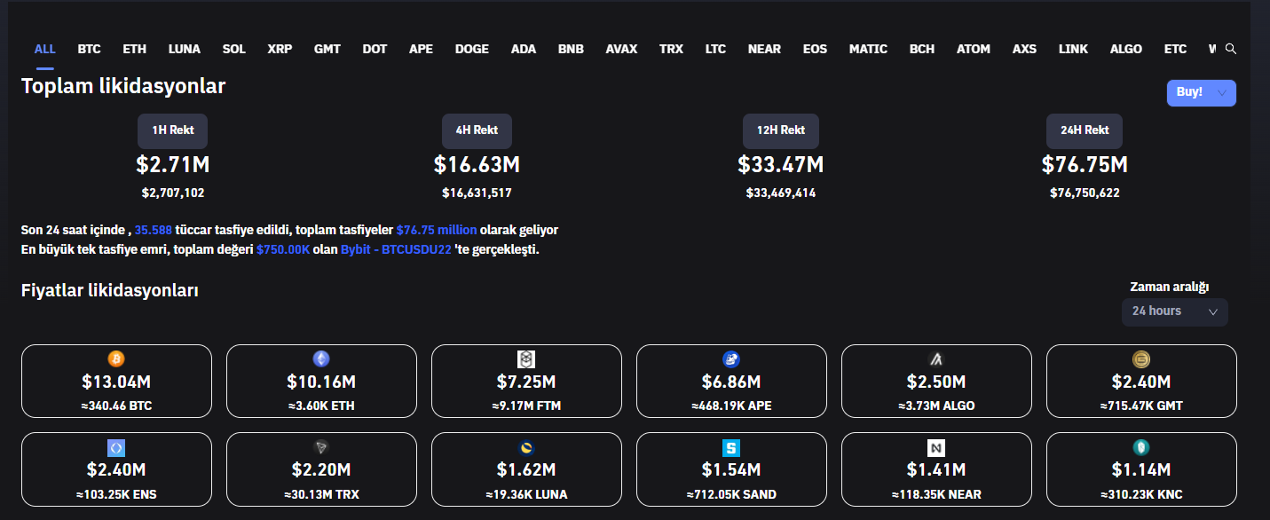 CoinGlass’ın aktardığı verilere göre son 24 saatte sadece 77 milyon dolarlık bir pozisyon likit edildi. Yaşanan hareketlerdeki likidasyon oranlarının azalması, sert bir hareketin başlayacağının ilk işareti olduğu düşünülmekte.