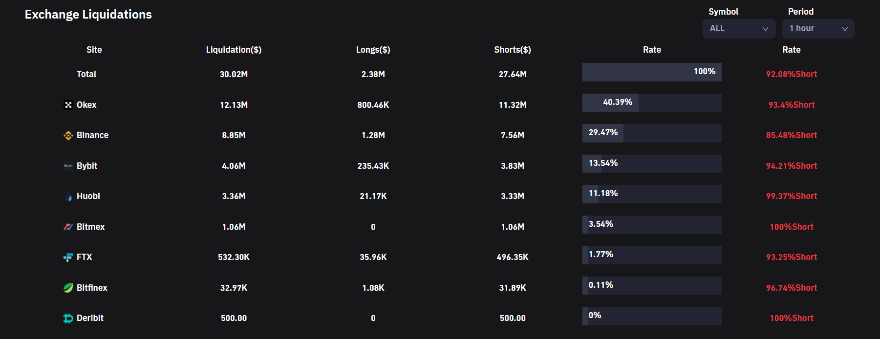Bitcoin ve kripto paralarda son 1 saat içerisinde likit olan pozisyonların %92’si short pozisyonlardan oluşmakta.