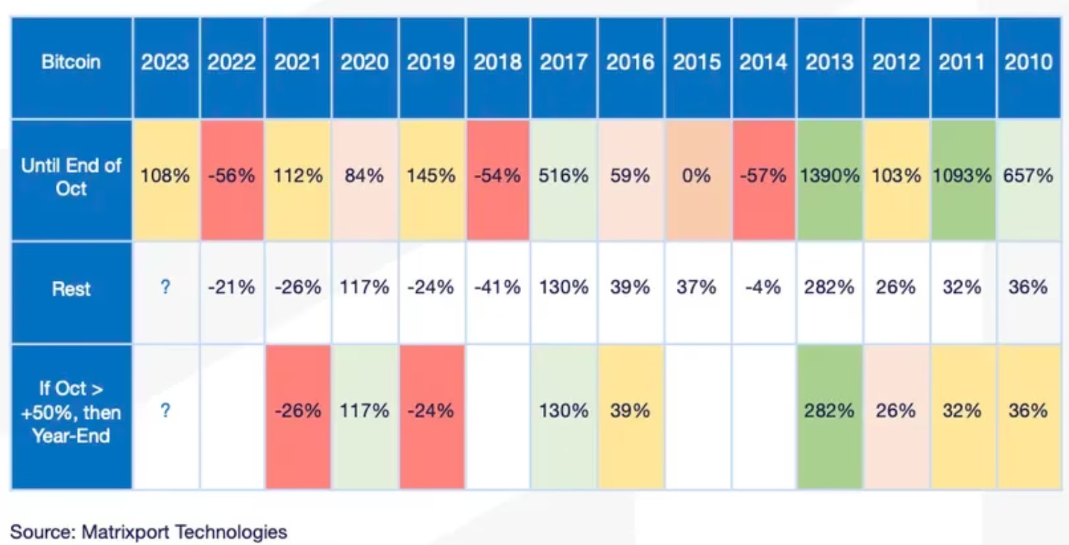 13 yıllık Bitcoin geçmişini inceleyen Thielen, BTC’nin son 12 yılın yedisinde ilk 10 ayda en az %100’lük bir yükseliş yaşadığını vurguluyor.