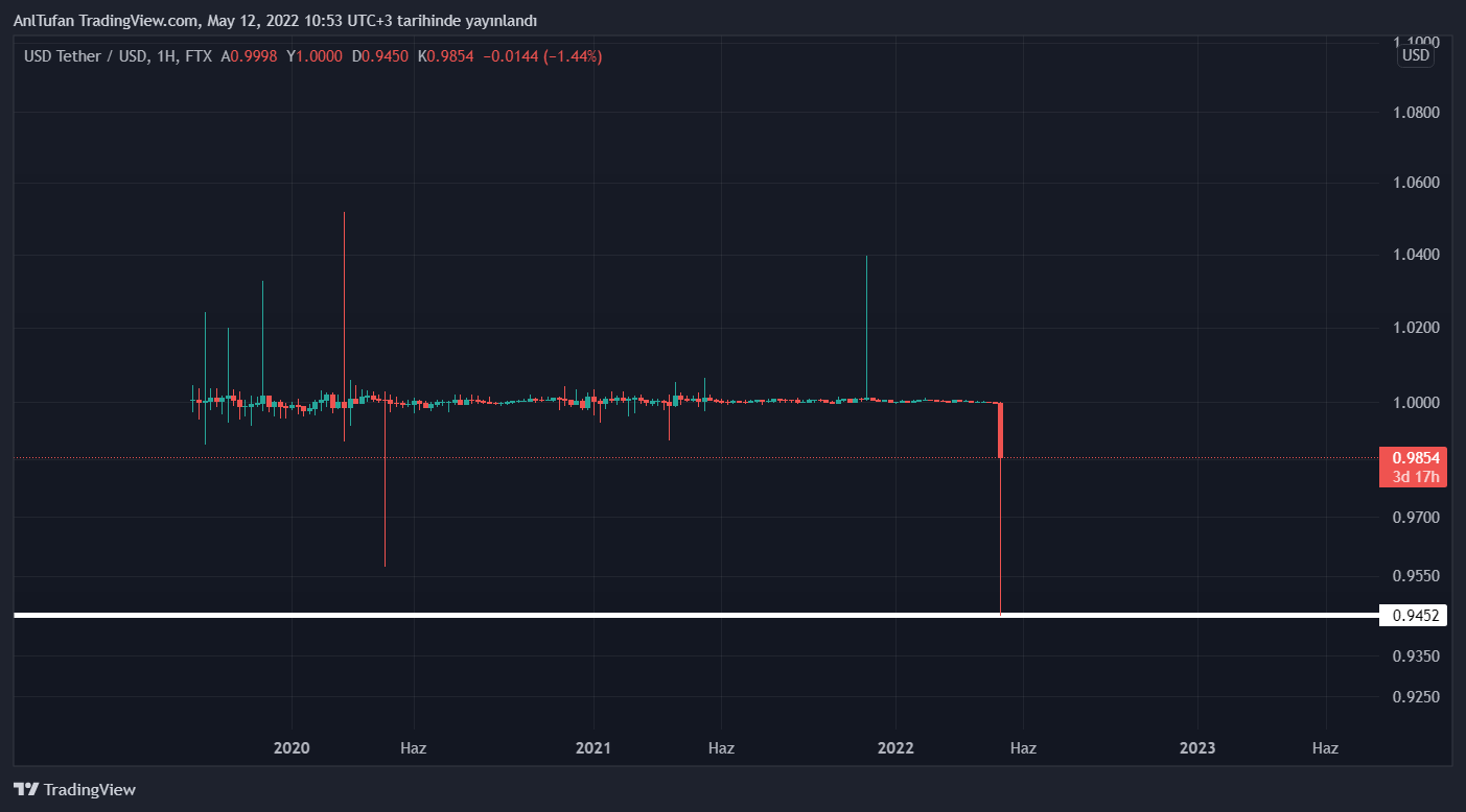 Birçok farklı borsaya göre farklı değerlere ulaşan USDT, FTX borsasının aktardığı verilere göre 0.9452 dolar seviyelerine kadar geriledi.