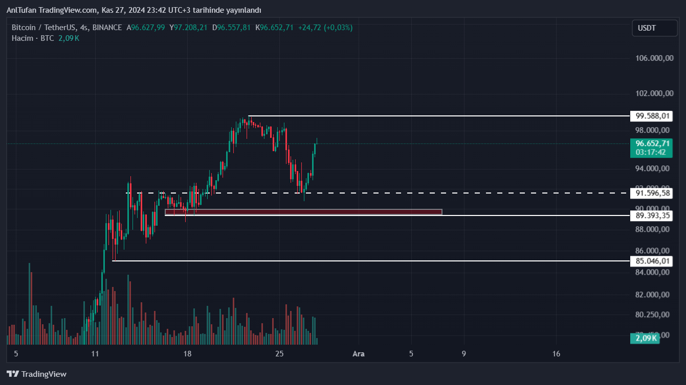 Şuan itibariyle lider kripto para birimi Bitcoin (BTC) 96.600 dolar seviyelerinden işlem görüyor. 89 bin – 92 bin dolar destek bölgesinden hızlıca sekmeyi başaran BTC, en dip bölgeden %7’den fazla yükseliş yaşadı.