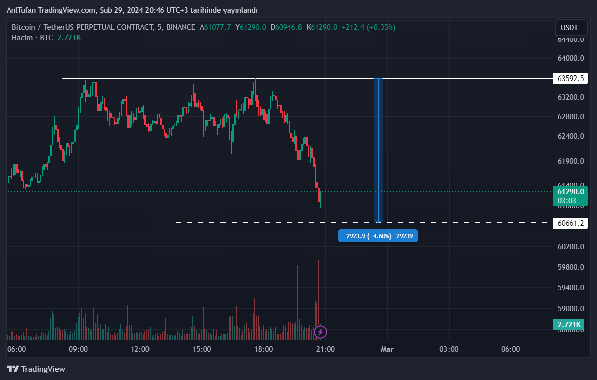 Bitcoin son dakikalarda yaşadığı düşüşler ile birlikte Binance vadeli piyasada 60.660 doları gördü. Bugünkü zirve noktası olan 63.600 dolardan ortalama %5’e yakın düşüş yaşayan BTC, dikkatleri üzerine çekti.