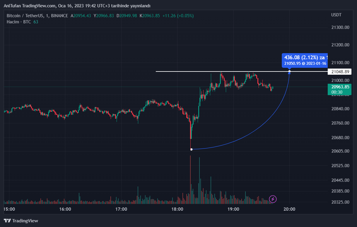 Piyasa yapıcı ise Bitcoin’in geçtiğimiz dakikalarda 20.600 dolar seviyelerine kadar düşüş yaşamasına izin verdi. Bu düşüşün ardından sonra ise boğaların tekrardan hareket geçtiği görüldü.