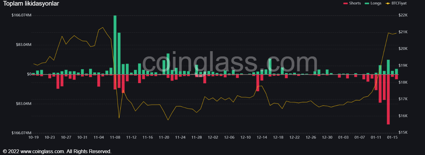 Başarılı veri sağlayıcısı olan CoinGlass’ın aktardıklarına göre, son dakikalardaki yükselişler yine ayıların sektörün dışına itilmesini sağladı. Her ne kadar ayılar likit edilmiş olsa da, BTC’nin yine 21 bin doları aşamaması, ilerleyen süreçte gerçekten bir düzeltmenin yaşanmasına sebebiyet verebilir gibi gözükmekte.