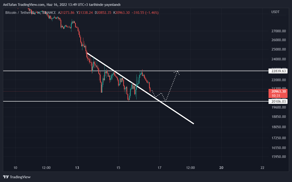 Dün itibariyle yukarı yönlü kırmayı başardığı düşen trendine bir retest hareketi gerçekleştiren BTC, bu trend seviyesi üzerinde tutunmayı başardığı takdirde, tekrardan 22.800 dolar seviyelerini hedefleyebilir.