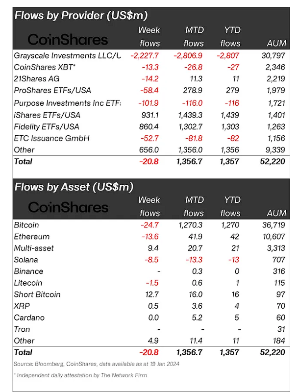 Spot Bitcoin ETF‘lerinin onaylandığı hafta BTC‘ye toplamda 1.2 milyar dolarlık bir giriş olmuştu. Geçtiğimiz haftadaki 21 milyon dolar değerindeki çıkışların çok büyük bir ehemmiyetinin olmadığı görülüyor.