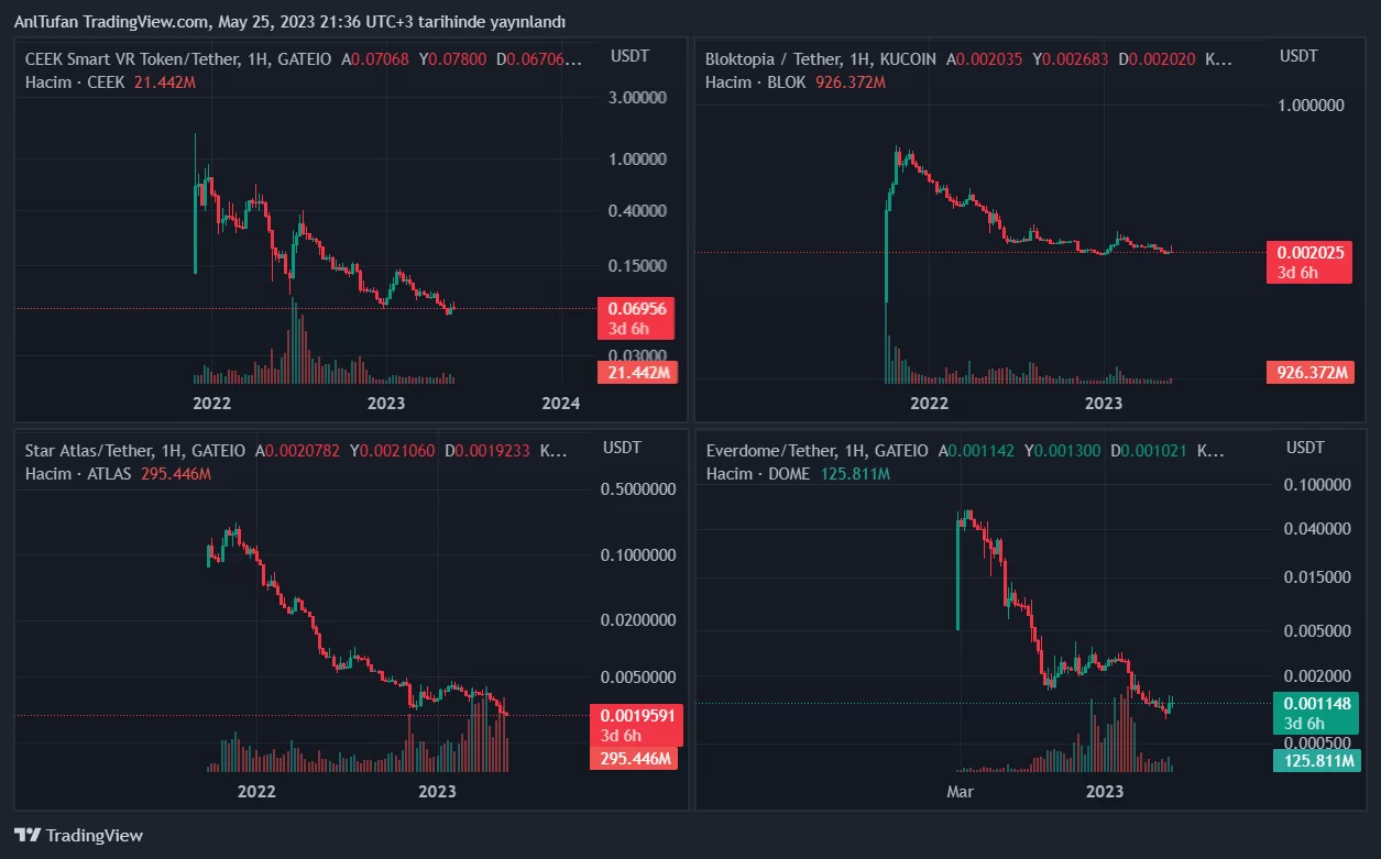 Geçtiğimiz boğa döngüsünün yıldızları metaverse altcoin’leriydi. CEEK, BLOK, ATLAS, RACA ve DOME gibi ürünler şuan itibariyle zirve seviyesinden çok uzakta.