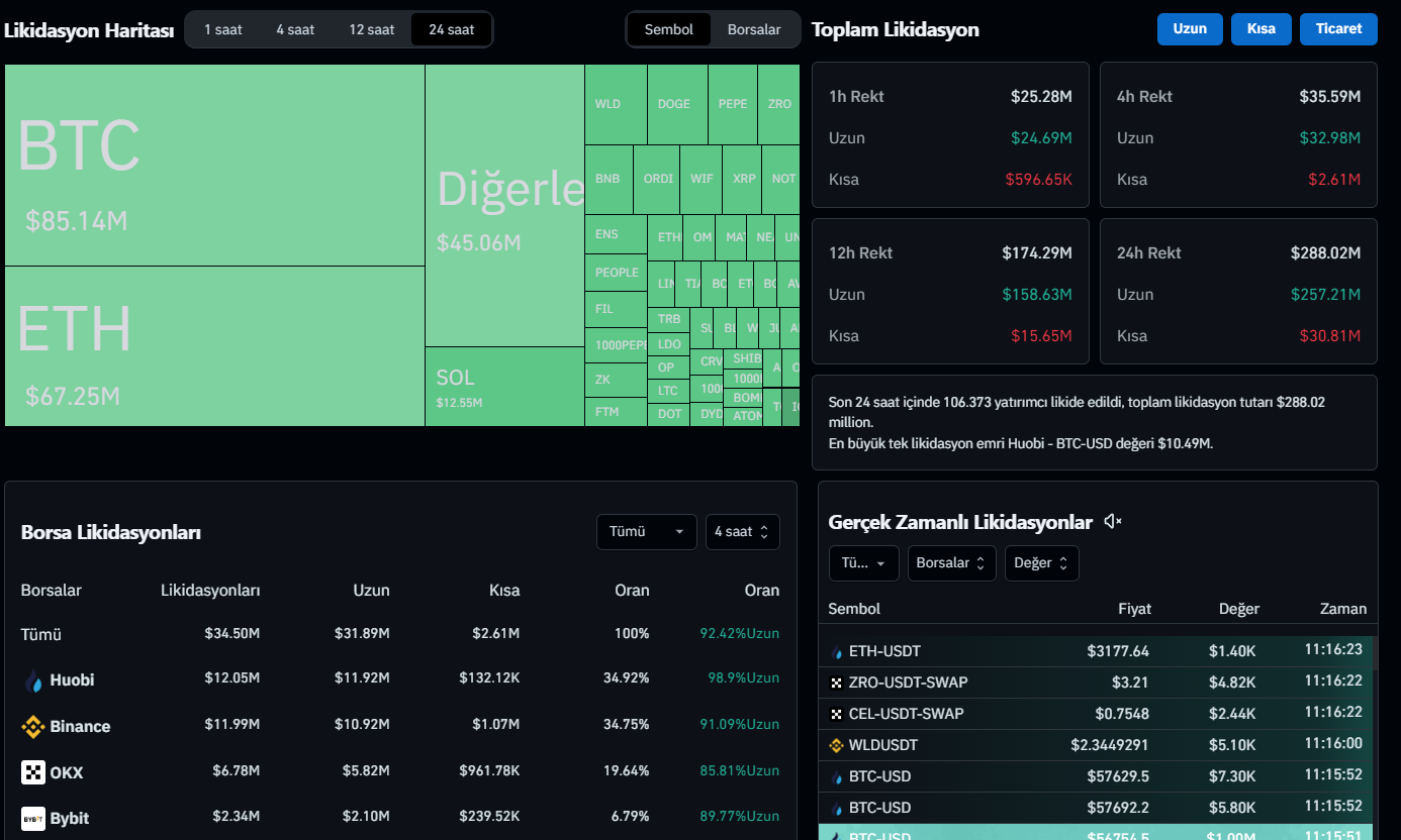 Son yaşanan düşüşler ile birlikte long pozisyon açan yatırımcılar likit edilmeye devam ediyor. Son 24 saat içerisinde kripto para piyasasında toplamda 289 milyon dolarlık pozisyon likit edildi.