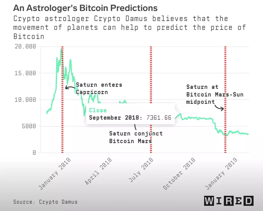 İsimsiz iki Amerikalı mali astrolog, Wired gazetecilerine, kripto para birimlerindeki fiyat hareketlerine ilişkin tahminler sipariş etmek isteyen yatırımcılarının sayısının son dönemde çok sert bir şekilde yükseliş yaşadığından bahsetti.