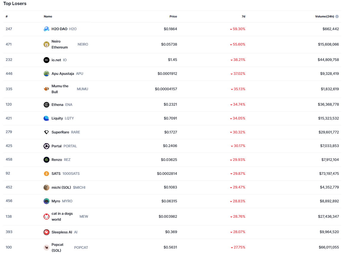 H2O’nun yanı sıra NEIRO, IO, APU, MUMU, ENA, LQTY, RARE ve PORTAL‘ın da %30’dan fazla düşüş yaşadığı gözlemlendi.
