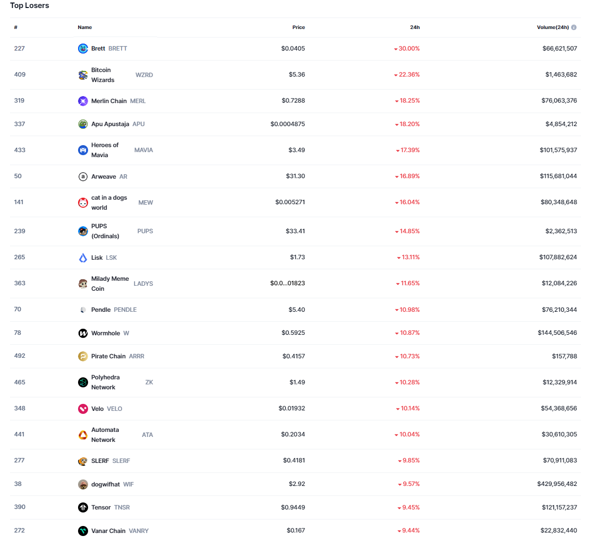 BRETT son 24 saat içerisinde %30 oranında değer kaybederken, WZRD, MERL, APU, MAVIA, AR ve MEW isimli altcoin’lerde ciddi düşüşler yaşadı.