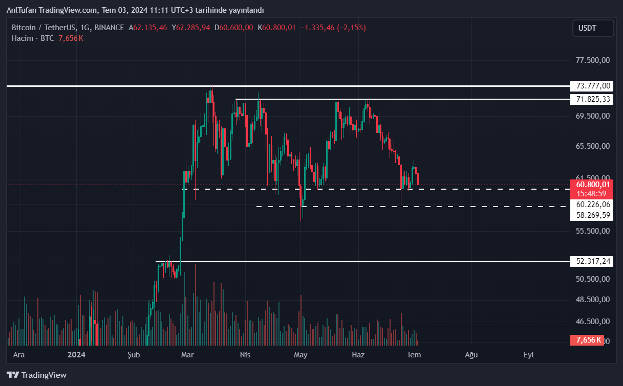 Şuan itibariyle Bitcoin’de gözler 60 bin dolar desteğinde. BTC’nin bu seviyede tutunması tekrardan toparlanmasını sağlayabileceği gibi bu desteğin kırılımı 58.200 dolara kadar bir düşüş getirecektir.