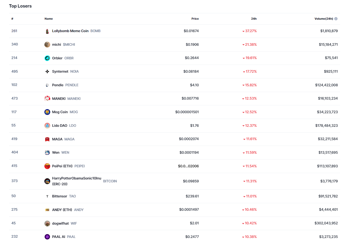 Bugün özelinde altcoin’lerde yine ani düşüşler meydana geldi. Son gelen bilgilere göre bugünün en çok düşen altcoin’i -%37 ile BOMB olurken, MICHI, ORBR, NOIA, PENDLE, MANEKI, MOG ve LDO‘da kayda değer düşüşler yaşadı.