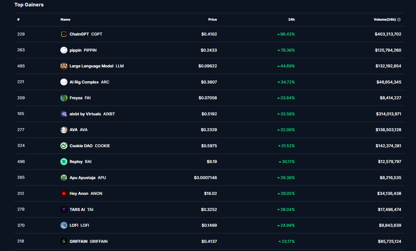 CGPT’nin yanı sıra PIPPIN, LLM, ARC, FAI, AIXBT, AVA, COOKIE ve RAI‘nin de %30’dan fazla bir yükseliş sergilediği gözlemlendi.