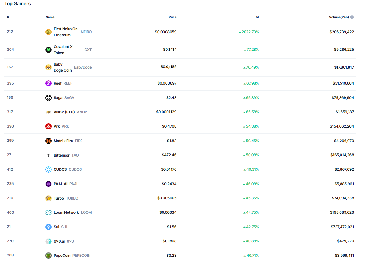 Başarılı veri sağlayıcısı CoinMarketCap’in aktardıklarına göre ilk 500 kripto para birimi içerisinde son 7 gün özelinde en çok artışı %2022 ile birlikte NEIRO isimli altcoin gerçekleştirdi.