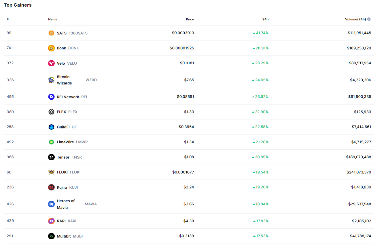 Bugün özelinde %41 oranında değer kazanmayı başaran SATS dikkatleri üzerine çekerken, BONK, VELO, WZRD, REI, FLEX, GF, LMWR ve TNSR isimli altcoin’lerde %20’den fazla değer kazandı.