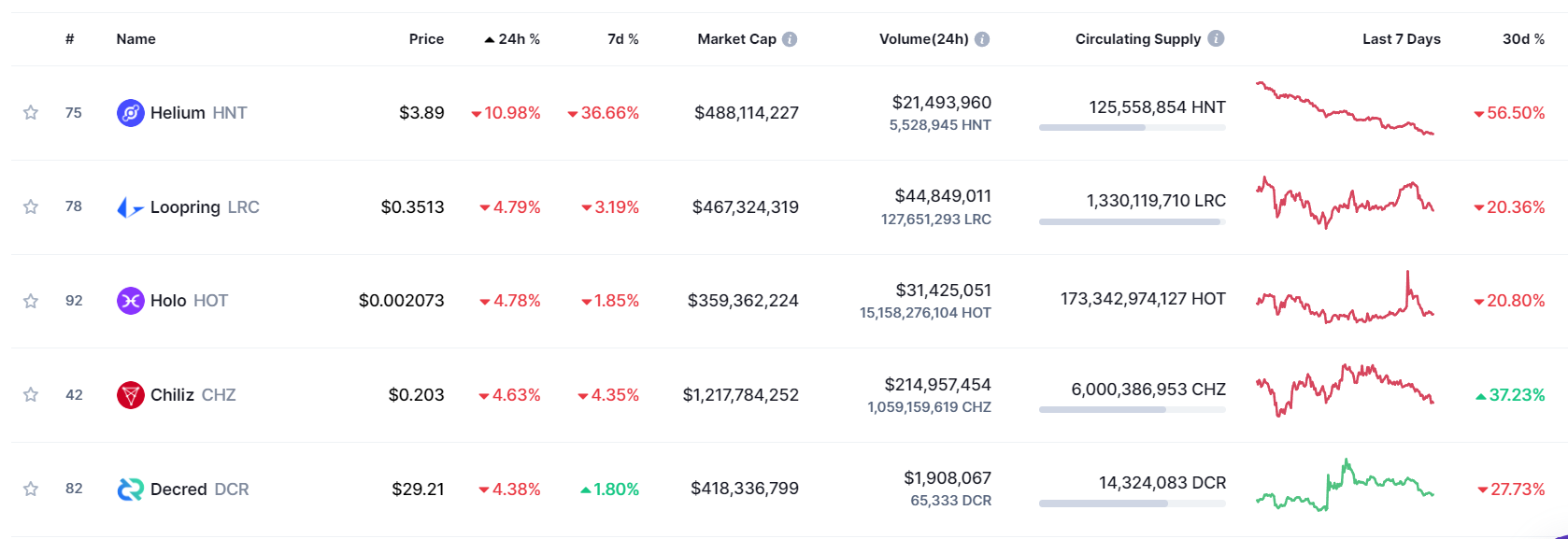 CoinMarketCap’in paylaştıklarına göre, ilk 100 kripto para birimi içerisinde bu 5 altcoin sektörün en çok düşüş yaşayan ürünleri olarak ön plana çıktı: