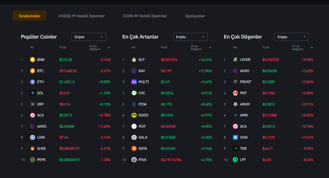 İşlem hacmine göre dünyanın en büyük kripto para borsası Binance’de listelemiş altcoin’lere baktığımızda, bugün %10’dan fazla sadece SLP ve RAY‘ın yükseliş yaşadığı görüldü.