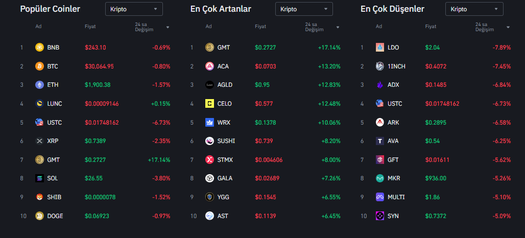 İşlem hacmine göre dünyanın en büyük kripto para borsası Binance’den alınan verilere göre son 24 saat içerisinde en büyük artışı GMT isimli altcoin gerçekleştirdi.