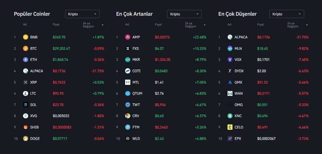 Hadi gelin Binance‘deki altcoin’lerin son durumuna birlikte göz atalım: