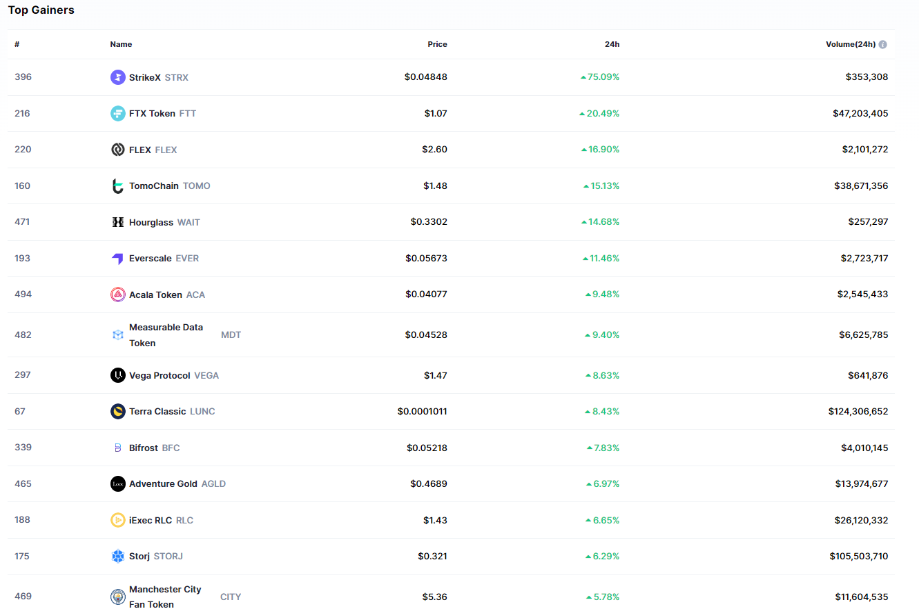 Başarılı bir veri sağlayıcısı olan CoinMarketCap’in aktardıklarına göre bugün itibariyle ilk 500 kripto para birimi içerisinde en büyük yükselişi StrikeX (STRX) isimli altcoin yaşadı.