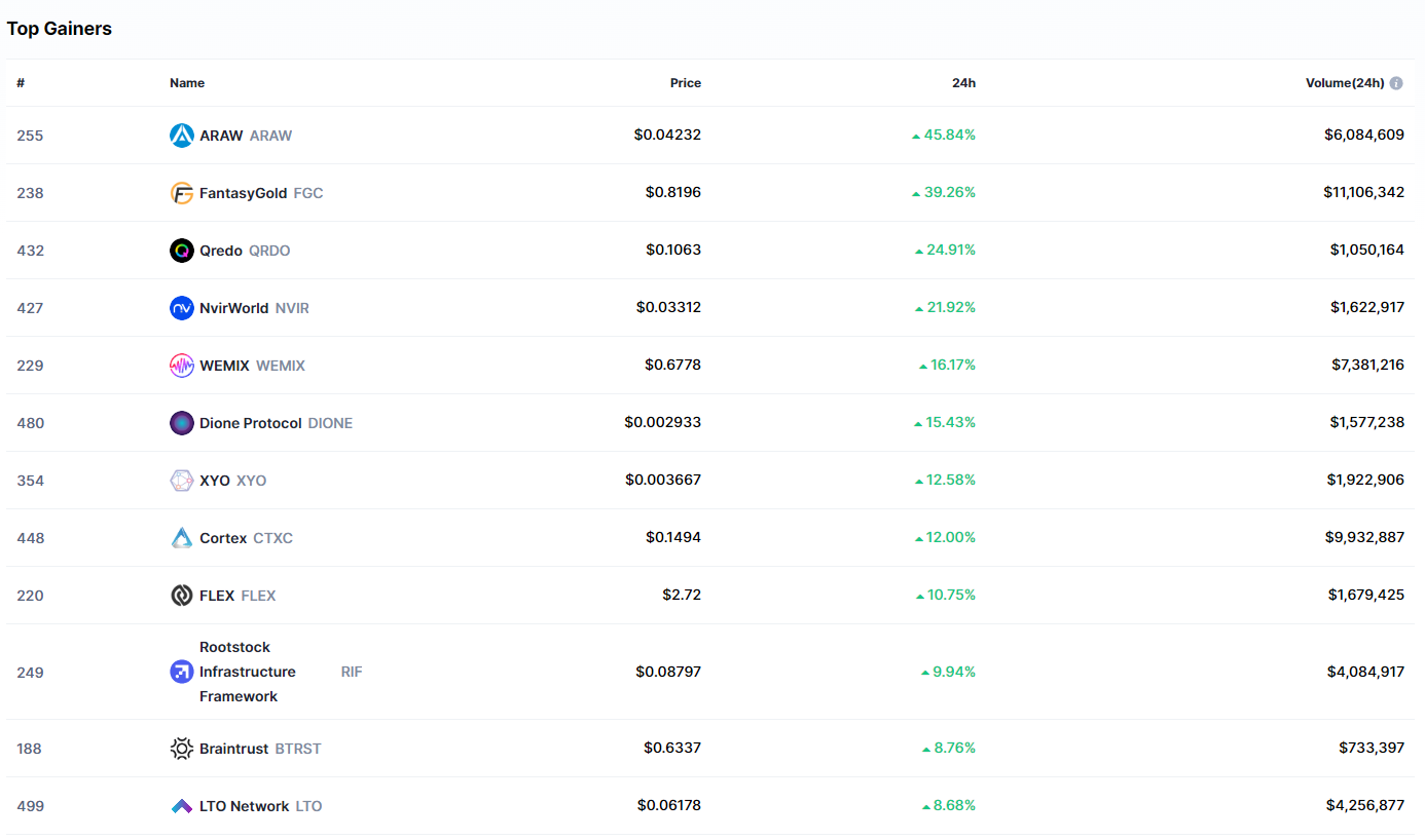Son 24 saat içerisinde yüzde 45 oranında yükseliş yaşayan ARAW, birçok kripto para yatırımcısının dikkatini üzerine çekmeyi başardı. ARAW haricinde şu altcoin’lerde sert yükselişler yaşadı: