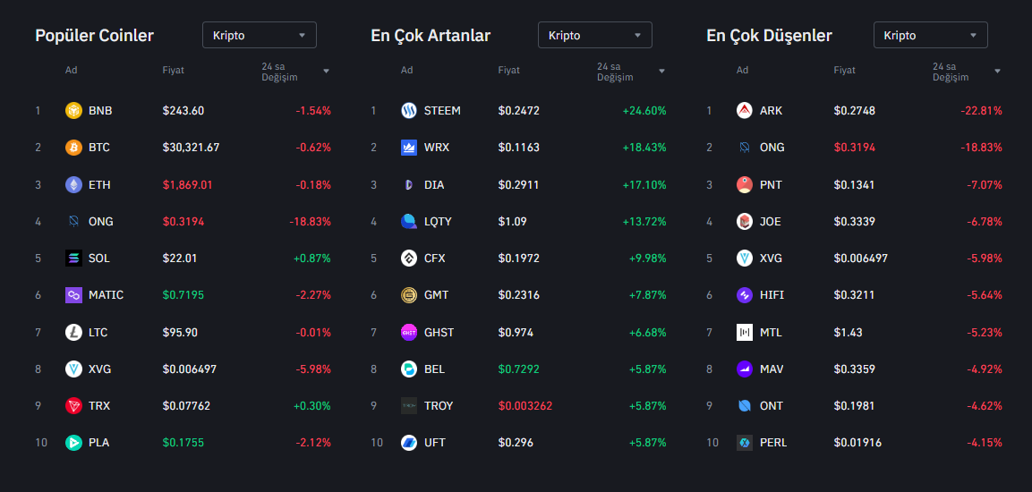 İşlem hacmine göre dünyanın en büyük kripto para borsası Binance‘den alınan verilere göre bugün itibariyle en büyük yükselişi STEEM isimli altcoin yaşadı.