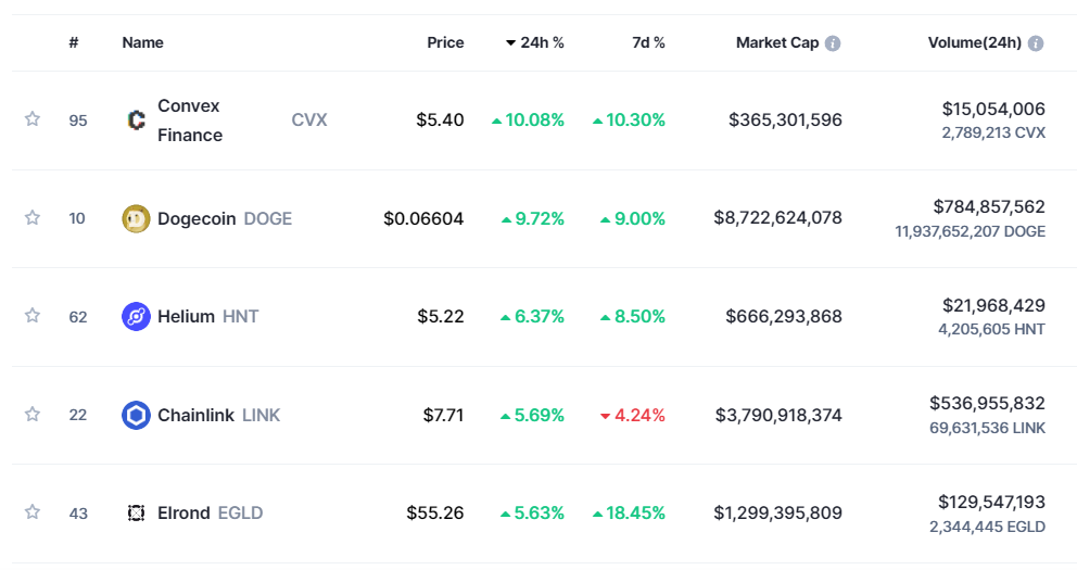 Bitcoin’in yüzde 4’e yakın yükseliş yaşadığı bugünde ise Convex Finance (CVX) gibi bazı altcoin‘lerin yüzde 10’dan fazla değer kazandığı gözlenmekte.