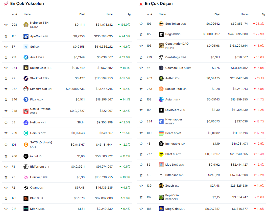 Bu haftanın yıldızı NEIRO isimli altcoin oldu. NEIRO son 7 gün içerisinde %155 oranında yükselirken, APE, SUI, AVAIL, RLB, STRK ve CAT‘in de %15’den fazla yükseliş yaşadığı görüldü.