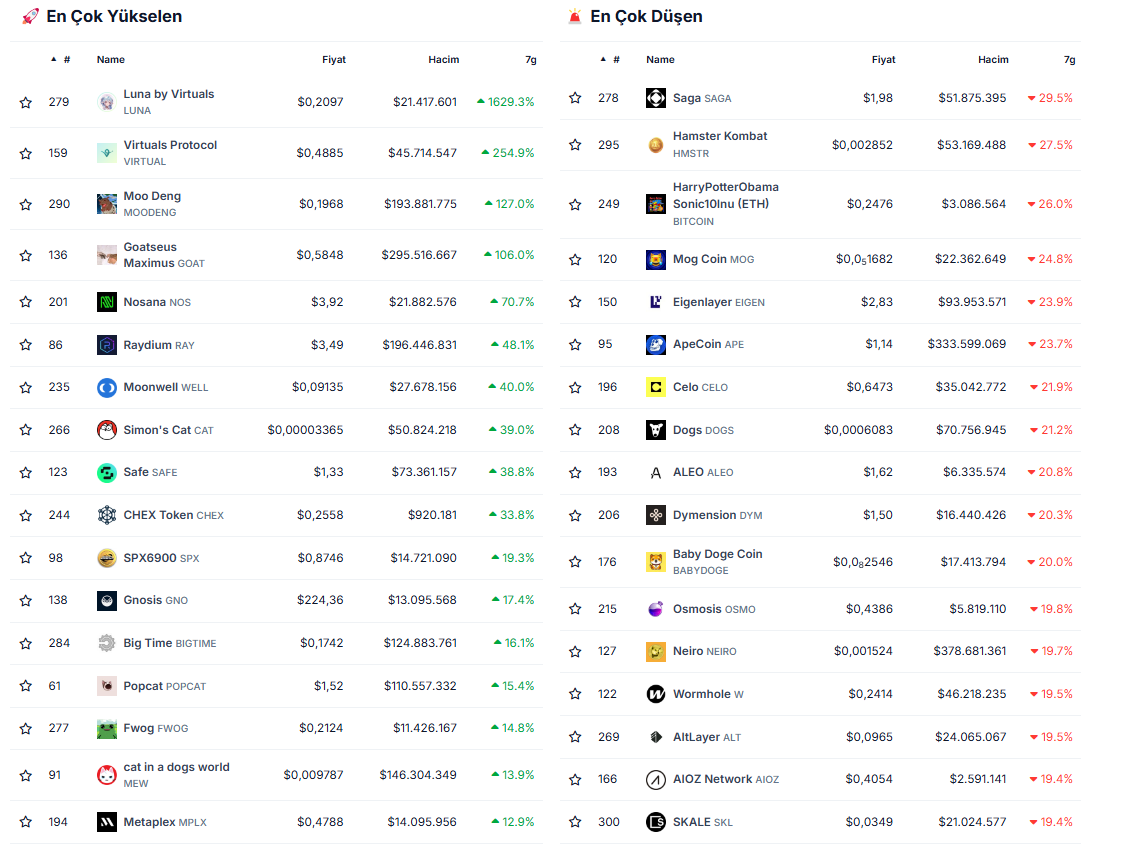 Son 7 gün özelinde en çok düşüş yaşayan altcoin’ler ise SAGA, HMSTR, BITCOIN, MOG, EIGEN ve APE oldu.