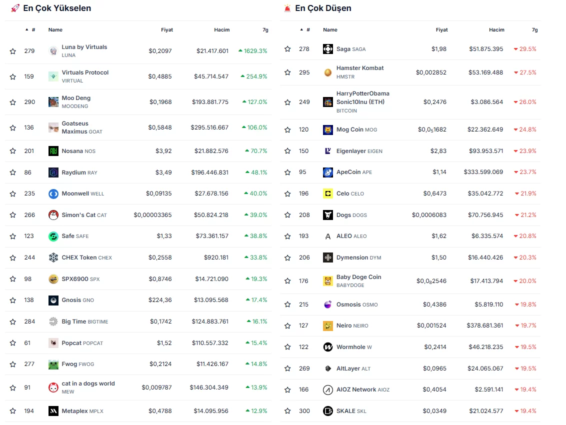 Hadi gelin bu haftanın en çok artan ve düşen altcoin’lerine birlikte göz atalım: