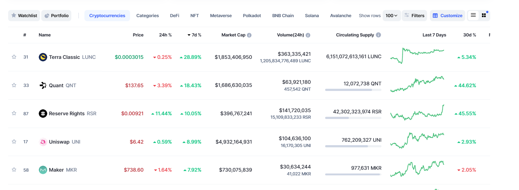 LUNC’nin yanı sıra, QNT, RSR, UNI ve MKR gibi altcoin’lerin de bu hafta itibariyle yatırımcılarını mutlu etmeyi başardığı görülüyor.